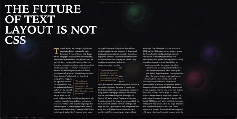 PRETEXT se salta todo eso. Preparas el texto una vez, y a partir de ahí el layout sale barato. DOM, Canvas, SVG — da igual. Simplemente funciona. Sin elementos ocultos, sin layout thrashing, sin cruzar los dedos.